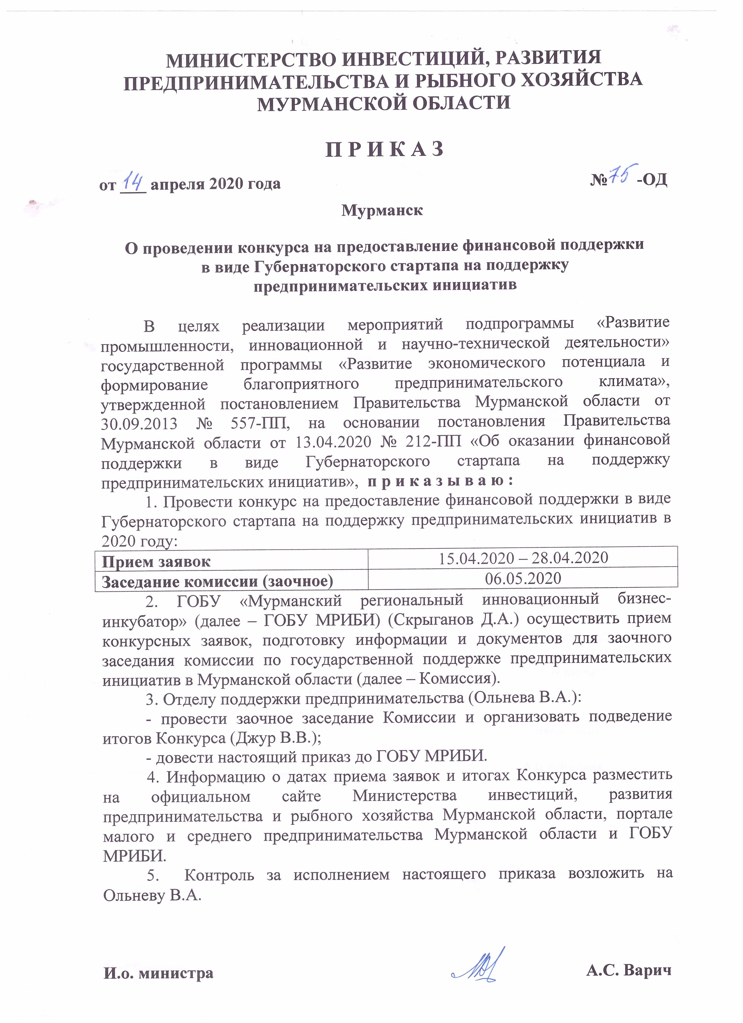 Приказ "О проведении конкурса на предоставление финансовой поддержки в виде Губернаторского стартапа на поддержку предпринимательских инициатив" от 14.04.2020 № 75-ОД